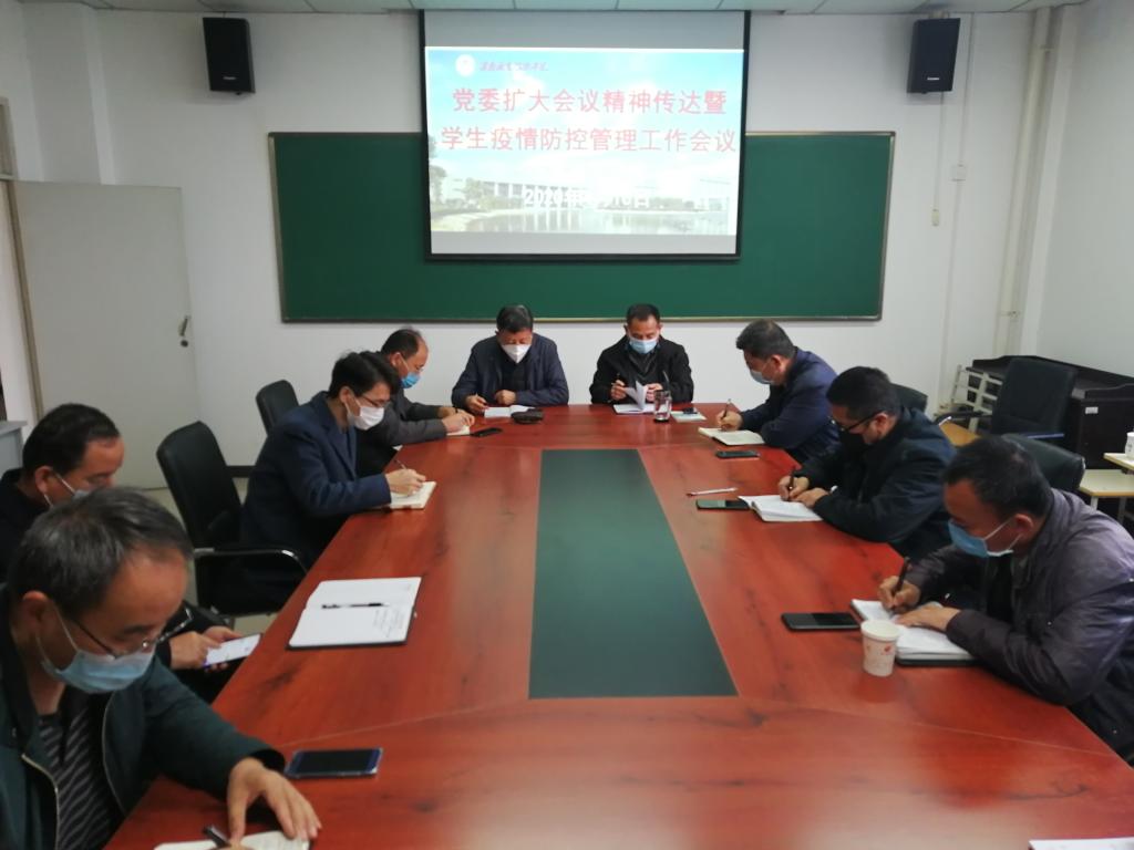 4月10日上午,388vip太阳集团在农学楼201会议室召开了公司党委扩大会议精神传达暨员工疫情防控管理工作专题会议,公司领导班子成员、全体辅导员及班主任参加,会议由党总支书记王俊全主持。