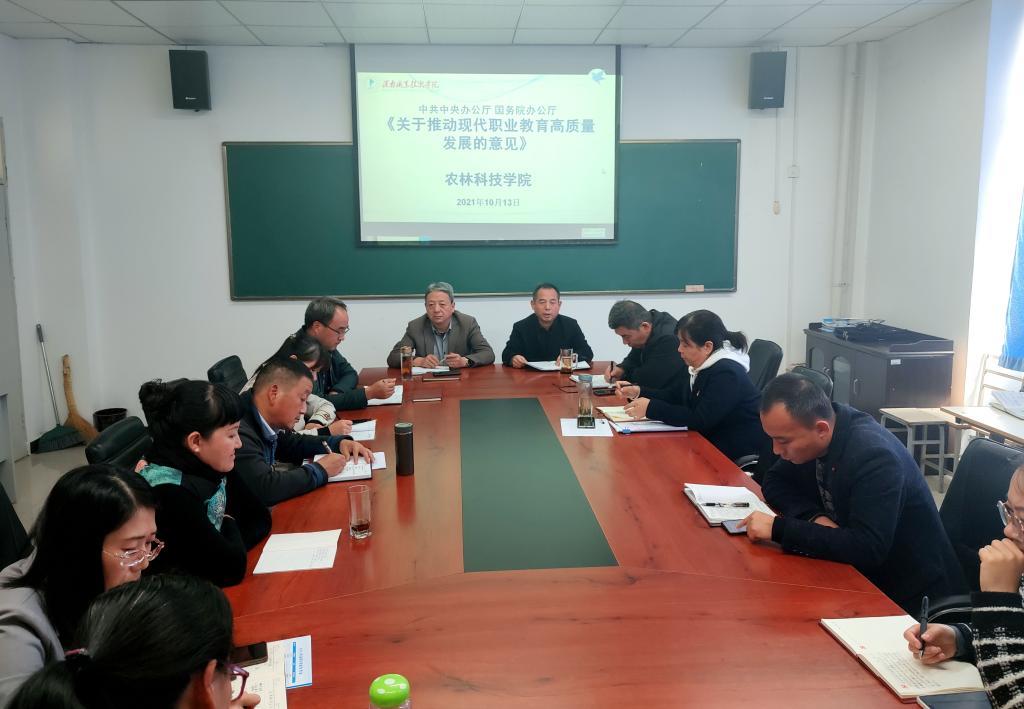 10月14日下午,388vip太阳集团在农学楼201会议室召开了全体教职工会议,学习了中办国办《关于推动现代职业教育高质量发展的意见》精神,部署安排388vip太阳集团落实发展意见的具体措施,会议由办公室主任王百祥主持。