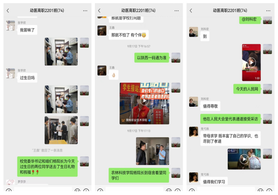润物无声化春雨。一是员工入学前各班建立班级群,让同学和老师们互相认识和了解,确定临时班干部,加强管理与沟通。群里互动气氛热烈,生动有趣。大家互作自我介绍,介绍家乡名胜古迹和地方特产,为祖国幅员辽阔地大物博感到骄傲和自豪。二是弘扬中华优秀传统文化,根据时令节气变化,介绍中秋节、重阳节、寒露等风俗习惯和文化知识,引导同学们热爱传统文化,自觉做传统文化的传播者和践行者。三是发挥典型示范引领作用,宣传近年来公司涌现出的优秀员工代表,用身边人身边事教育入校新生,鼓励他们树立信心,确定目标,勤学苦练,全面发展。四是关心员工冷暖,经理杨世选、总支副书记张小青、副经理付宏岐、办公室主任王百祥、辅导员樊永忠、李玉霄等经常到到宿舍看望生病员工,为他们送饭送药,并通过打电话发短信等形式跟进了解员工身体状况。根据气候变化情况,随时随地提醒同学们添衣保暖,谨防感冒。五是积极关注未返校员工思想动态和学习状况,及时回复员工疑虑困惑,鼓励他们增强信心,随时关注疫情变化,有序做好返校准备。